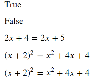 この場合、恒等式となる常に等しいくなるのでTrueと判断されます。一方、必ずしも等しくない場合には次のようになります。